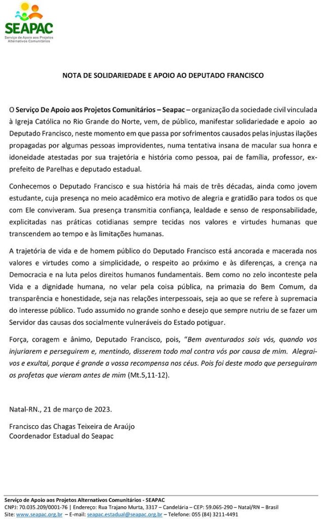 Leia abaixo a nota do Serviço de Apoio aos Projetos Comunitários – Seapac em solidariedade e apoio ao Deputado Francisco.