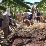 A compostagem é uma das formas de produção de adubo orgânico, utilizando esterco de animais (no caso foi usado o de gado e de ovelhas), cama de frango, palhas e cinzas. Todos os ingredientes são sobrepostos em forma de camadas. “No final, cobre-se a pilha da compostagem com palhas, para manter a umidade. Dentro de 30 dias, faz-se a revirada de todo esse material”. O objetivo é fazer o processo de diluição de todo o material, que vira adubo orgânico, rico em nutrientes e utilizado na adubagem de fruteiras e canteiros de hortaliças. “É um processo que recicla materiais e gera vida”, diz Fabrício.