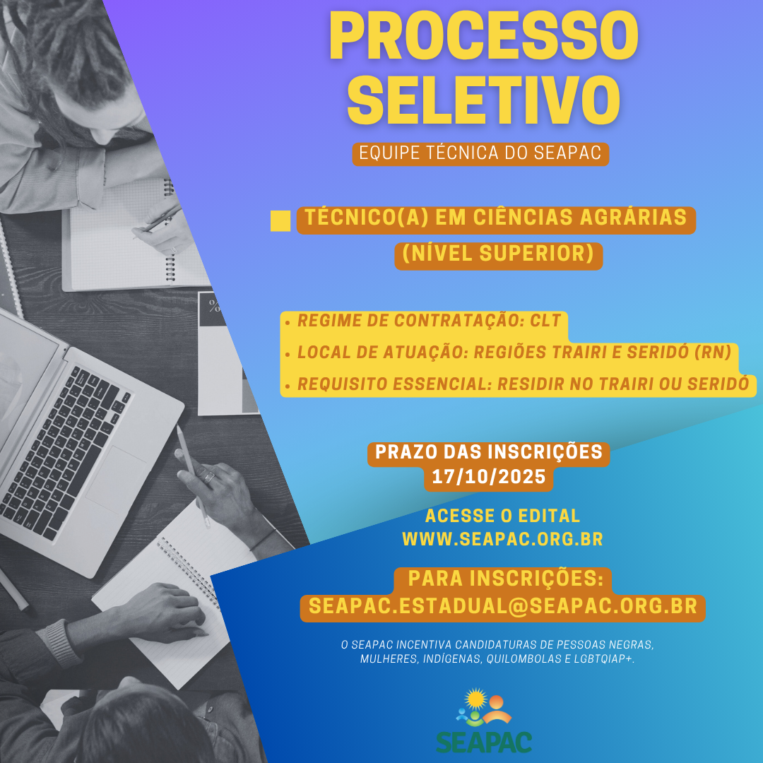 O Seapac está selecionando profissional de Ciências Agrárias para integrar sua equipe técnica, com contratação IMEDIATA. Profissionais interessados(as) e que atendam aos requisitos devem enviar até às 23h59 minutos do dia 17 de outubro de 2025 seu currículo para o e-mail.
